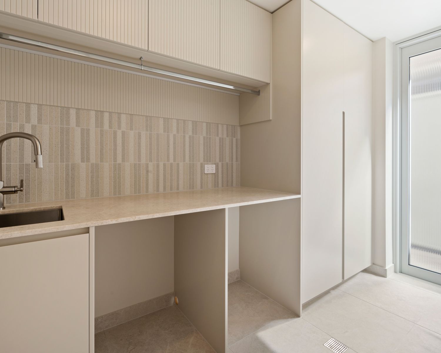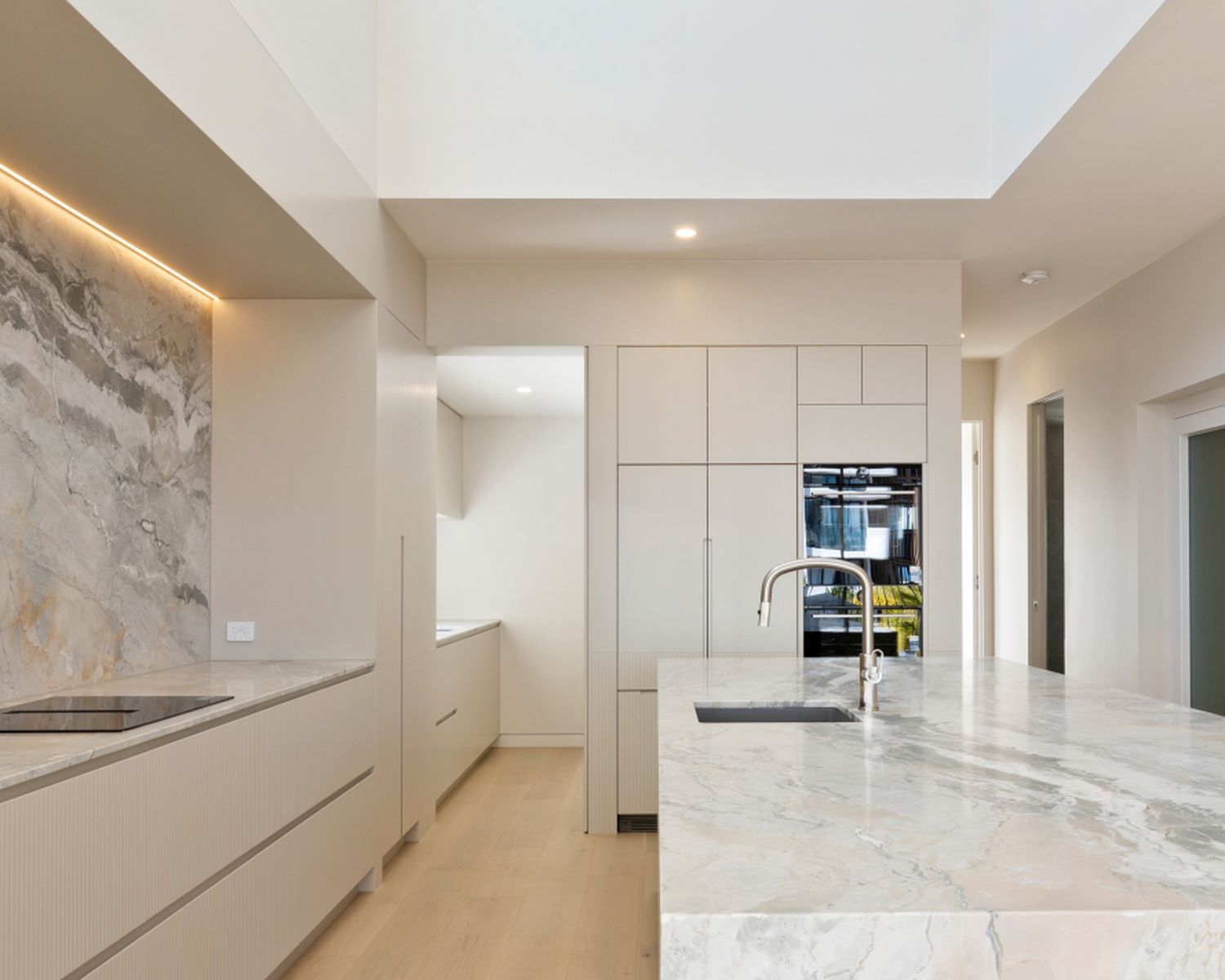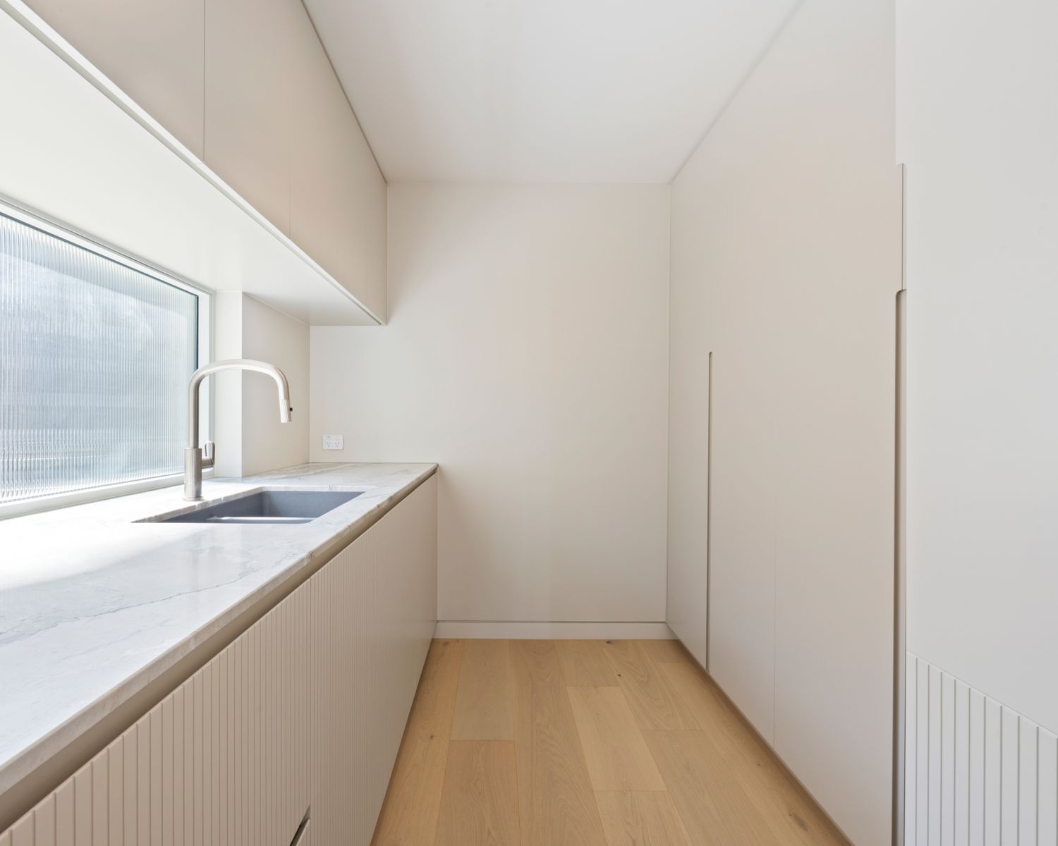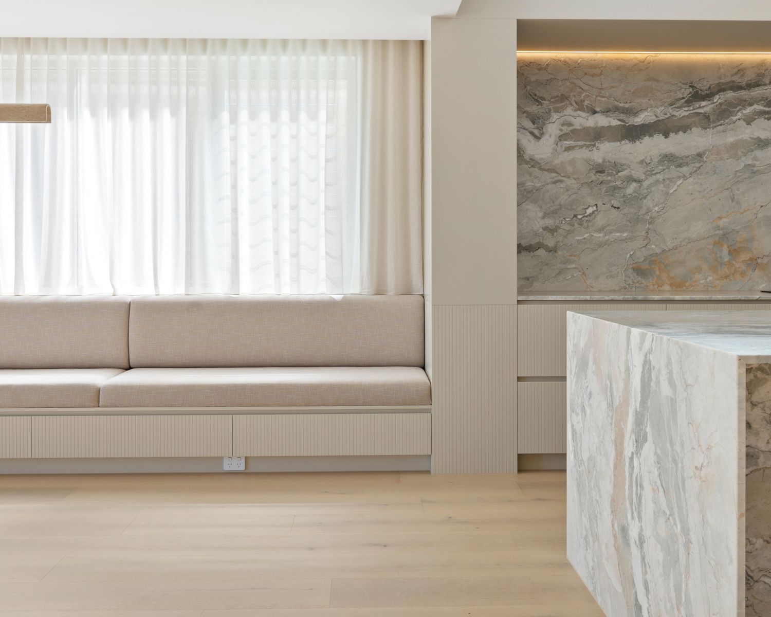 -Multi-purpose room with natural marble benchtop and joinery, floor to ceiling mirrored wall