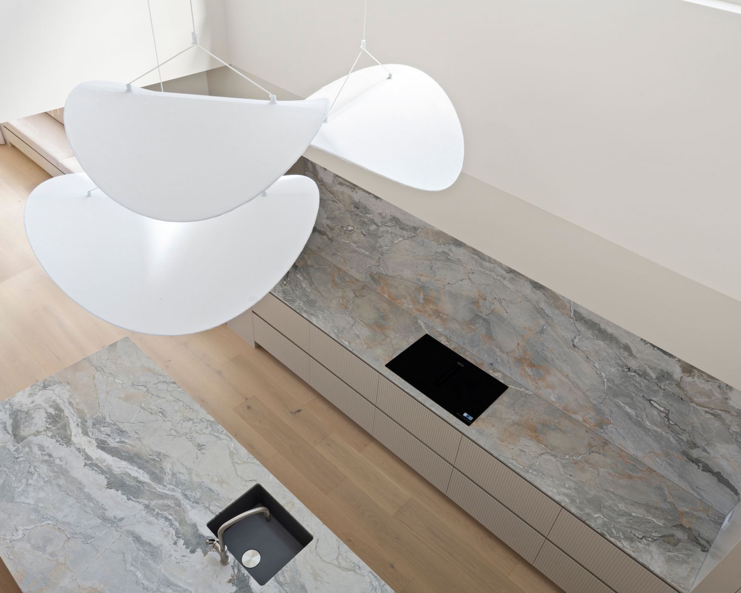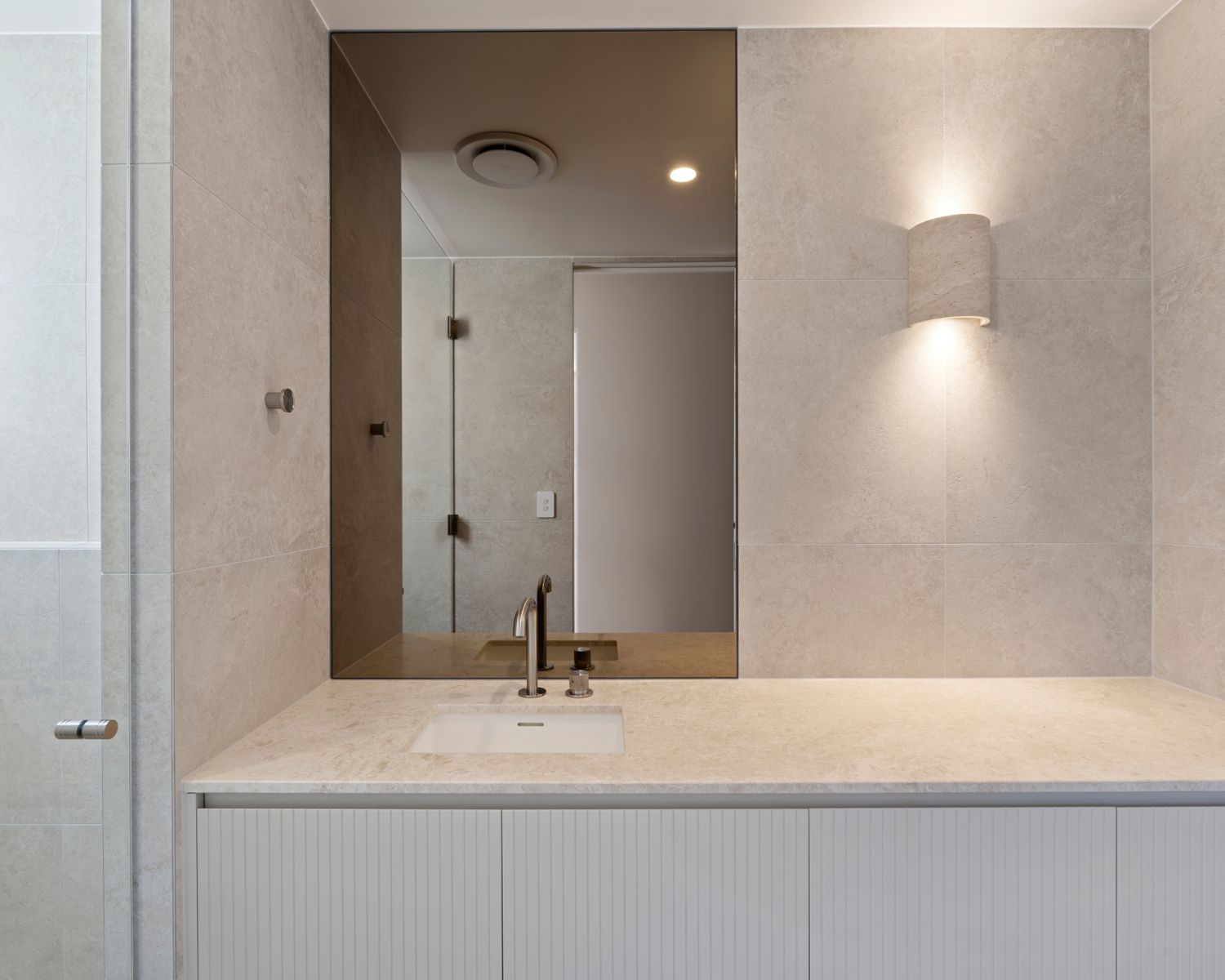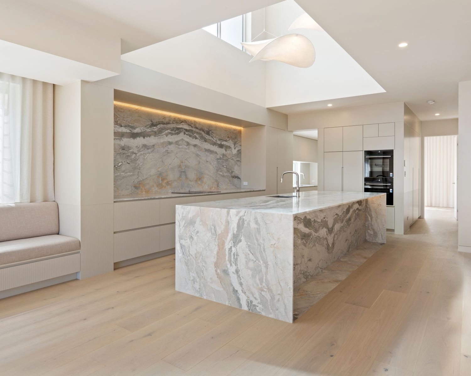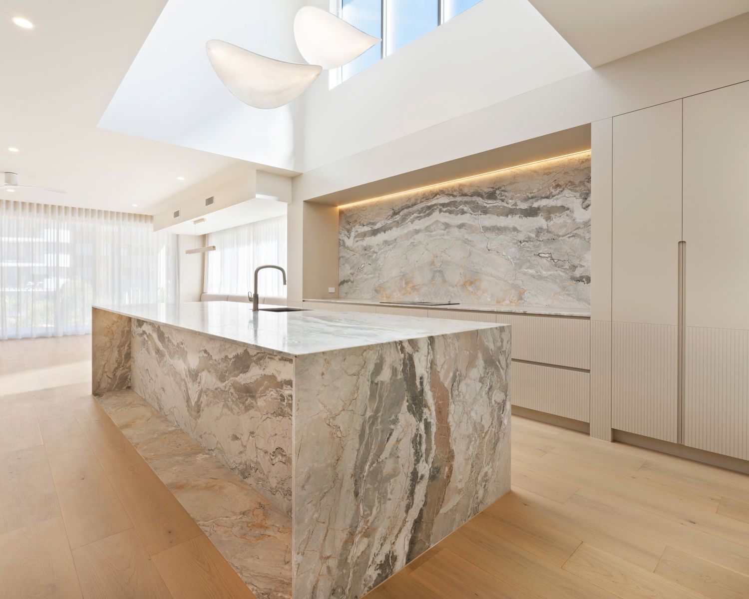 -Multi-purpose room with natural marble benchtop and joinery, floor to ceiling mirrored wall