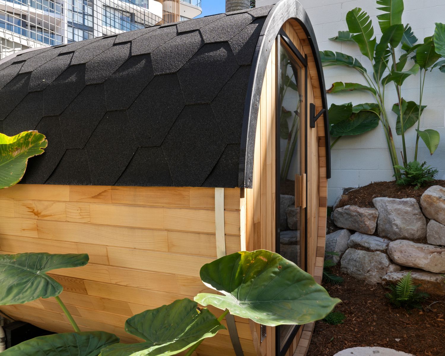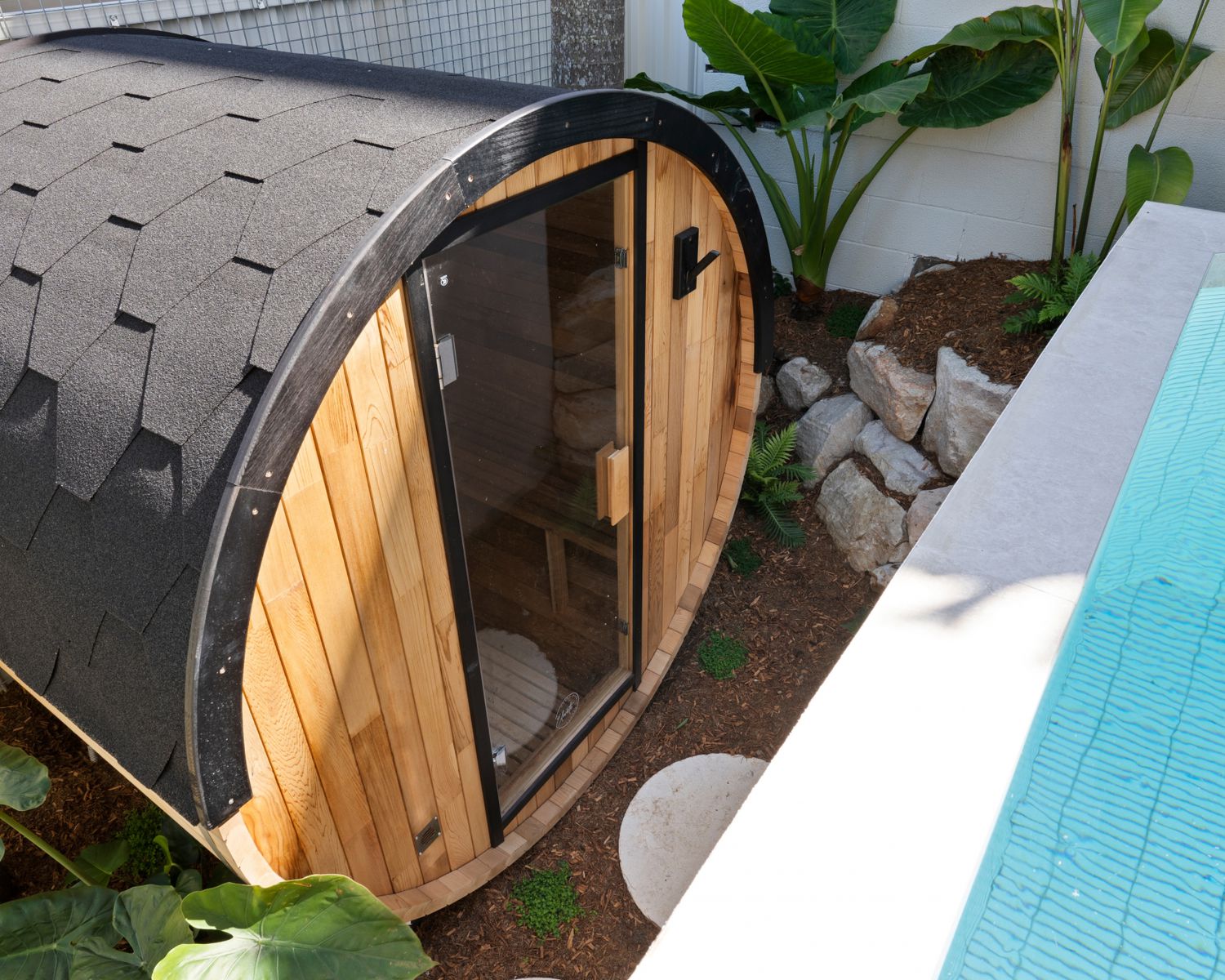 -Upper deck leading to the lower deck with heated in-ground plunge pool & Brand New Cedar Wood Sauna by Elevate Saunas