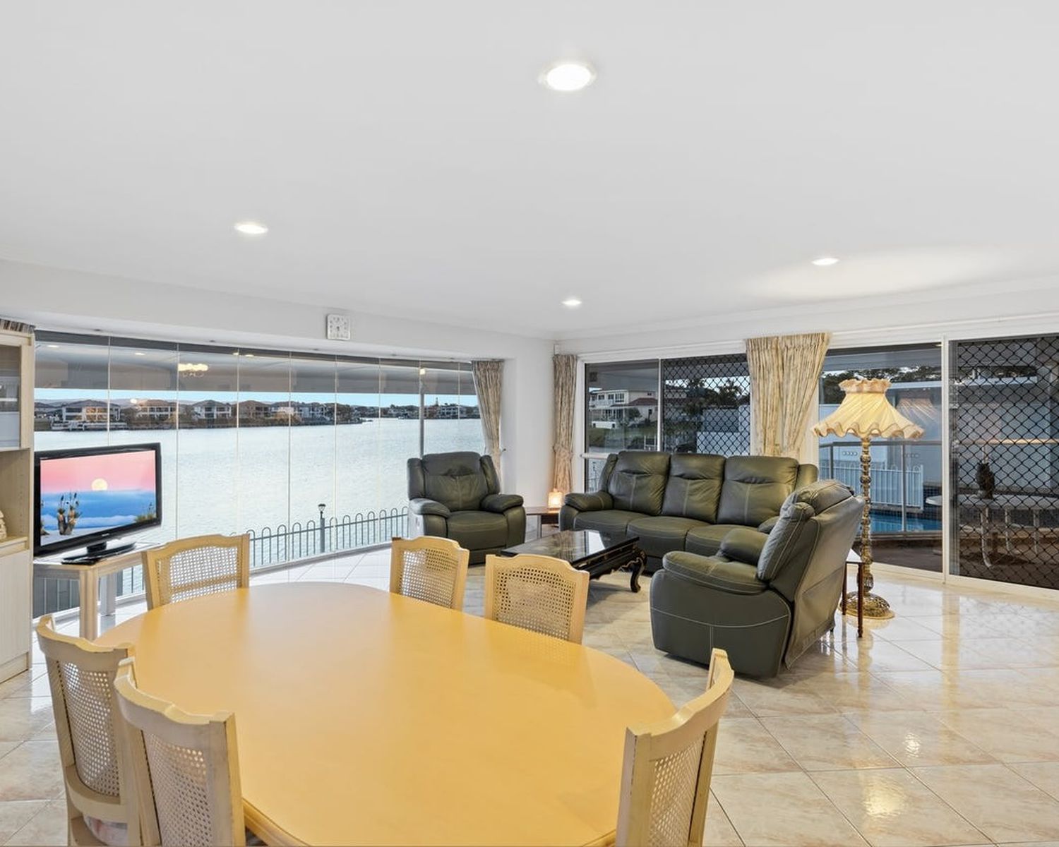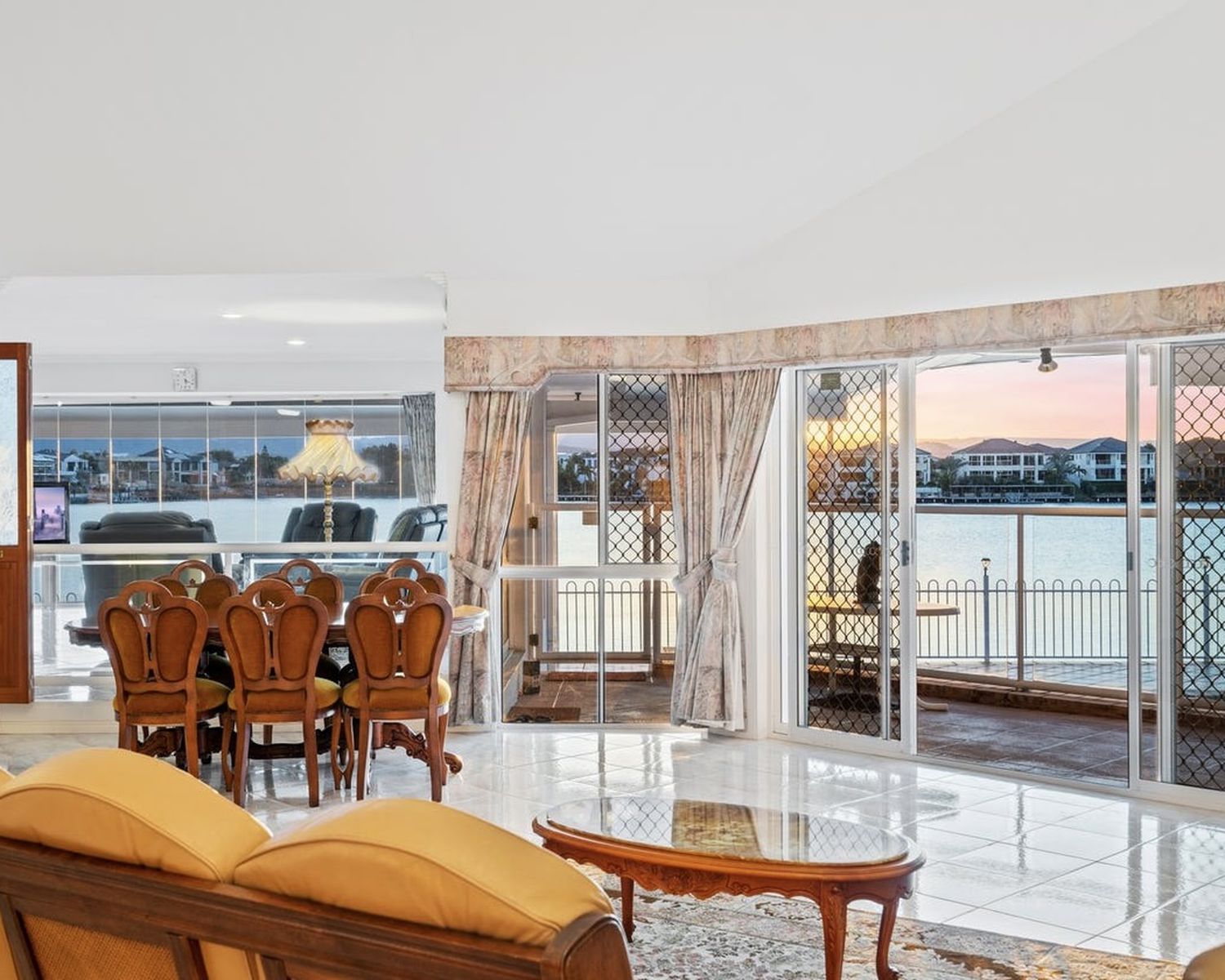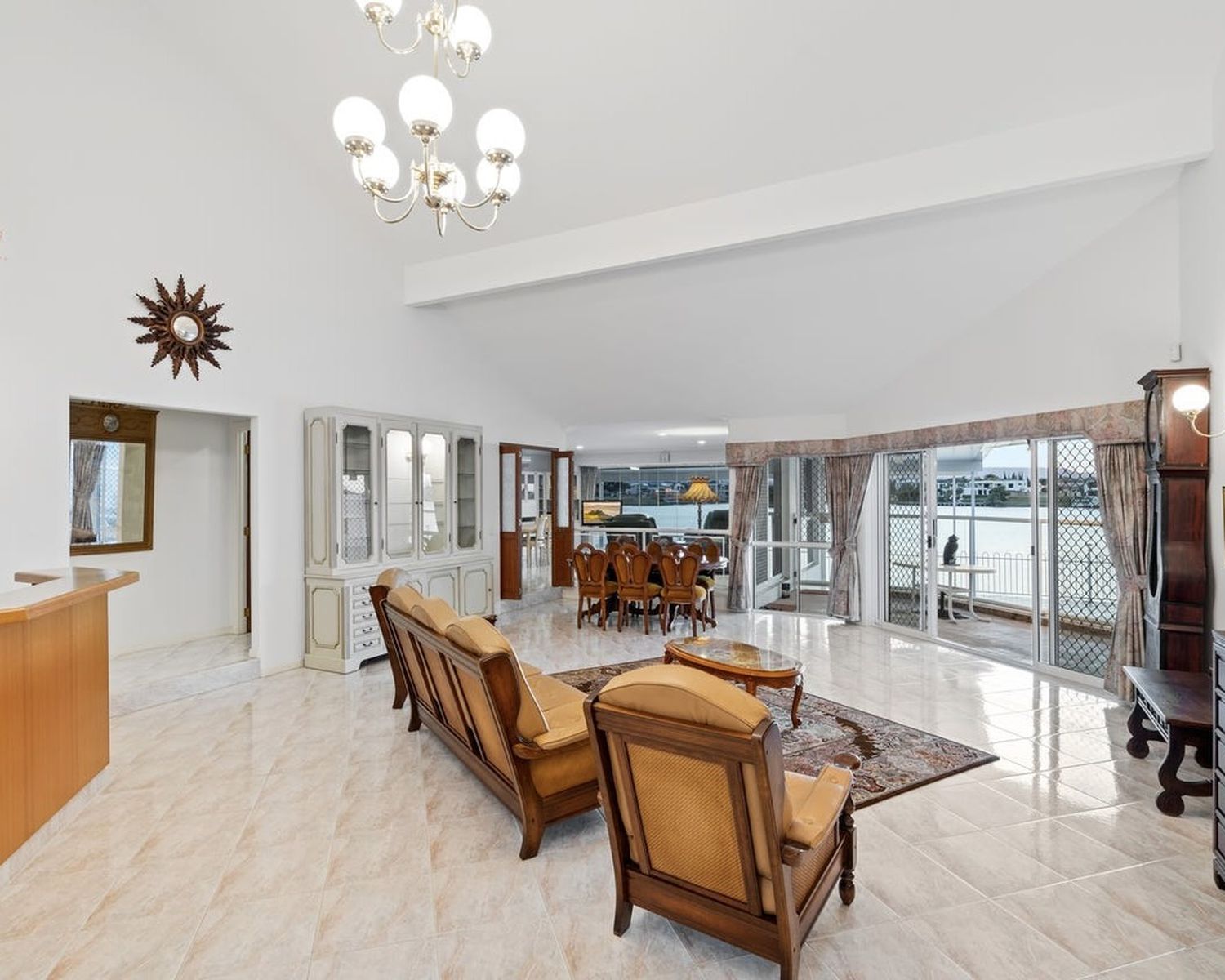 -Expansive open-plan living and dining area, boasting high ceilings and flowing onto the waterfront entertaining terrace