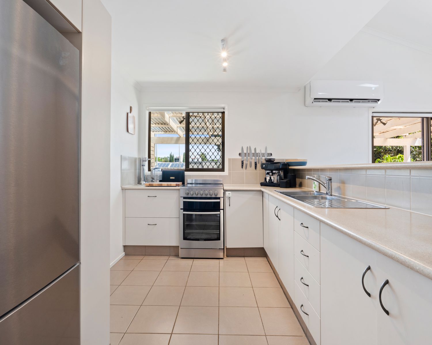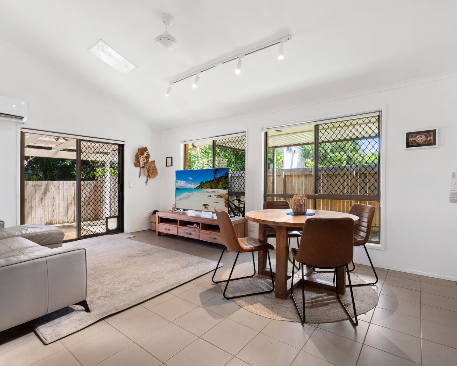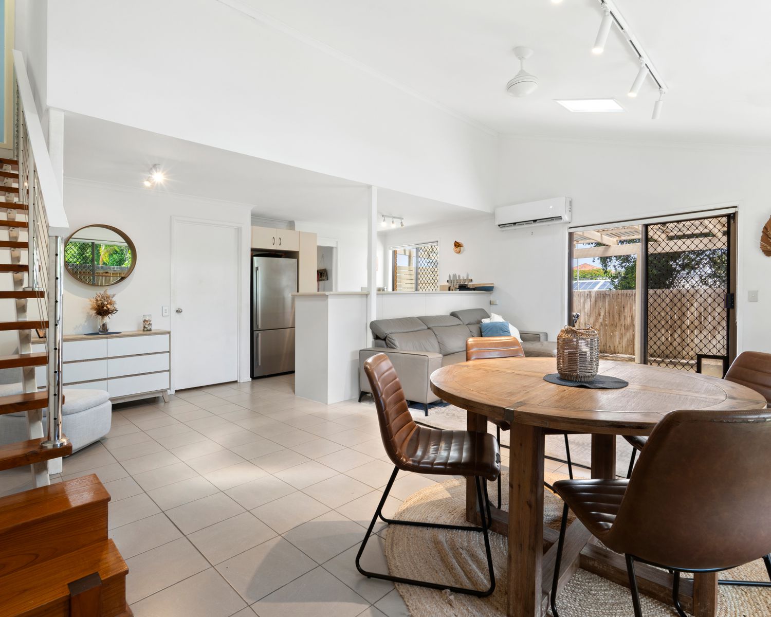 Open-plan living with air conditioning and dining area flowing to a private outdoor space