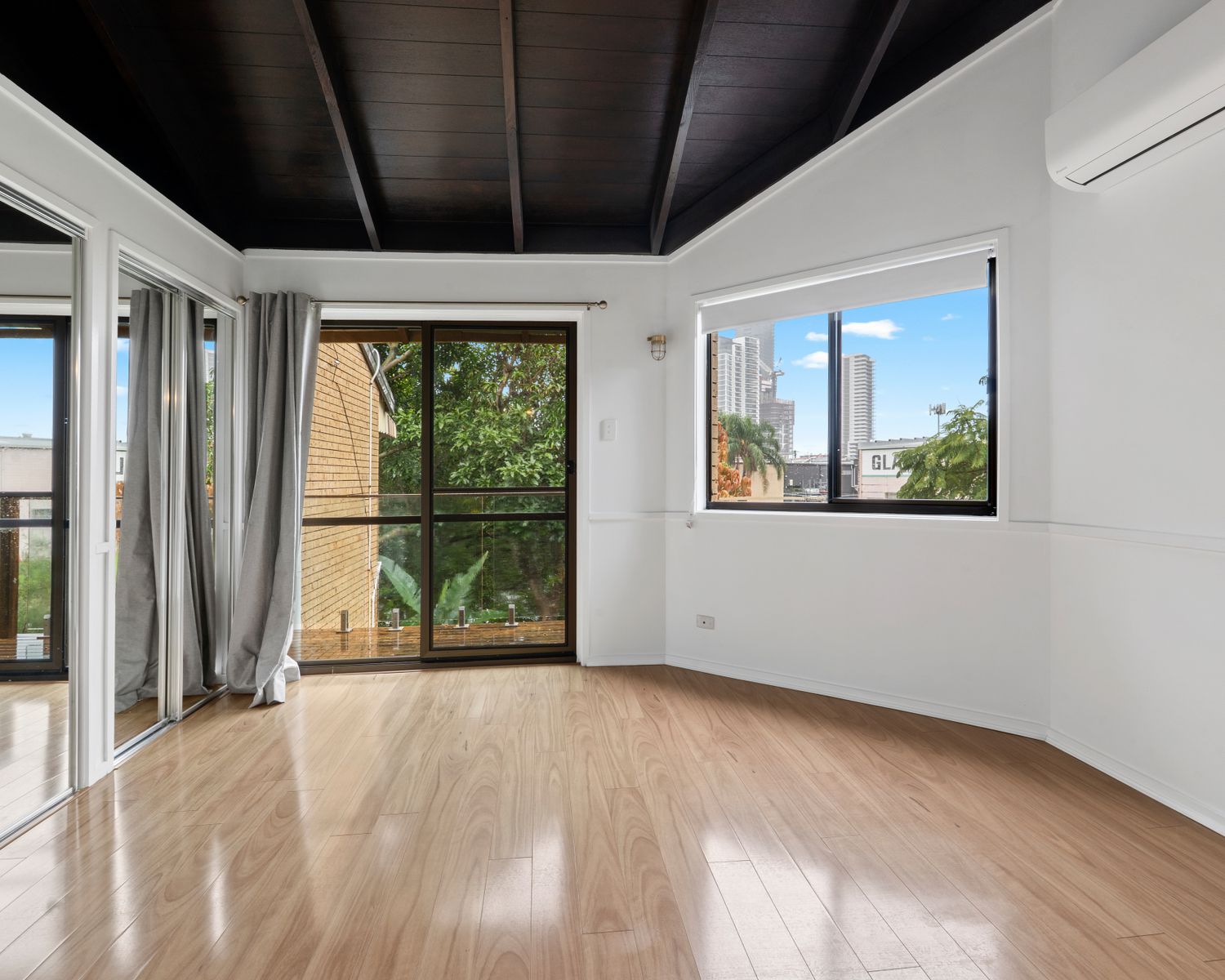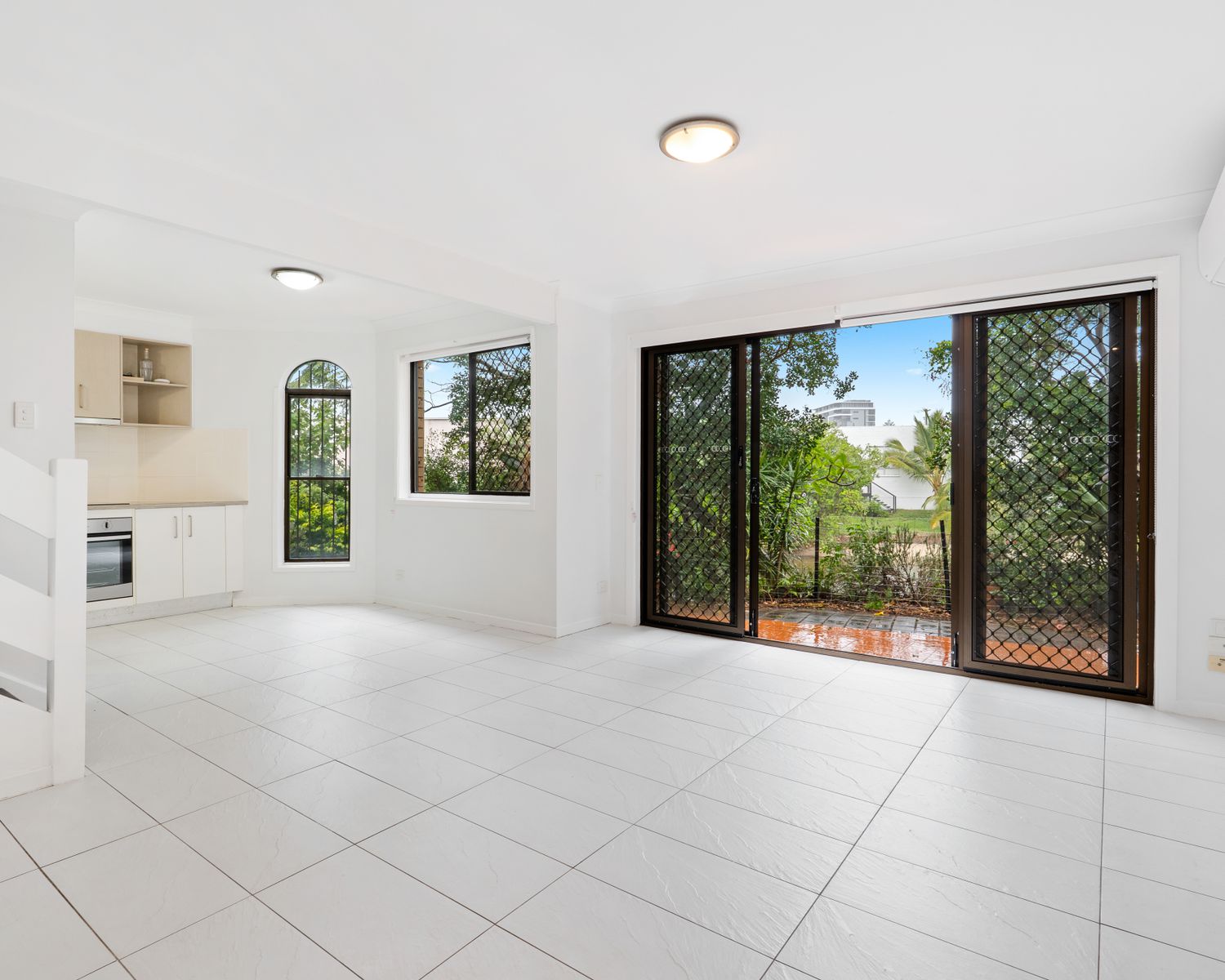 -Open plan living space with air conditioner, opening out to a back patio with canal views